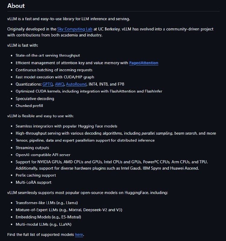 Предназначен для эффективного запуска LLM (LLaMA, Mistral, Qwen и др.) в продакшене и локально, особенно при большом количестве одновременных запросов. 📌 Основные особенности: 🔵Очень высокая скорость генерации текста 🔵Экономное использование видеопамяти 🔵Поддержка большого количества одновременных запросов 🔵Совместимость с OpenAI API 🔵Поддержка популярных языковых моделей 🔵Генерация ответов в реальном времени 🔵Стабильная работа под высокой нагрузкой 🔵Удобен для использования в продакшене 🔵Работает на GPU с CUDA ➡️Установка библиотеки: pip install vllm 📱 Репозиторий ⚙️ Документация ➡️Справочник Программиста. Подписаться