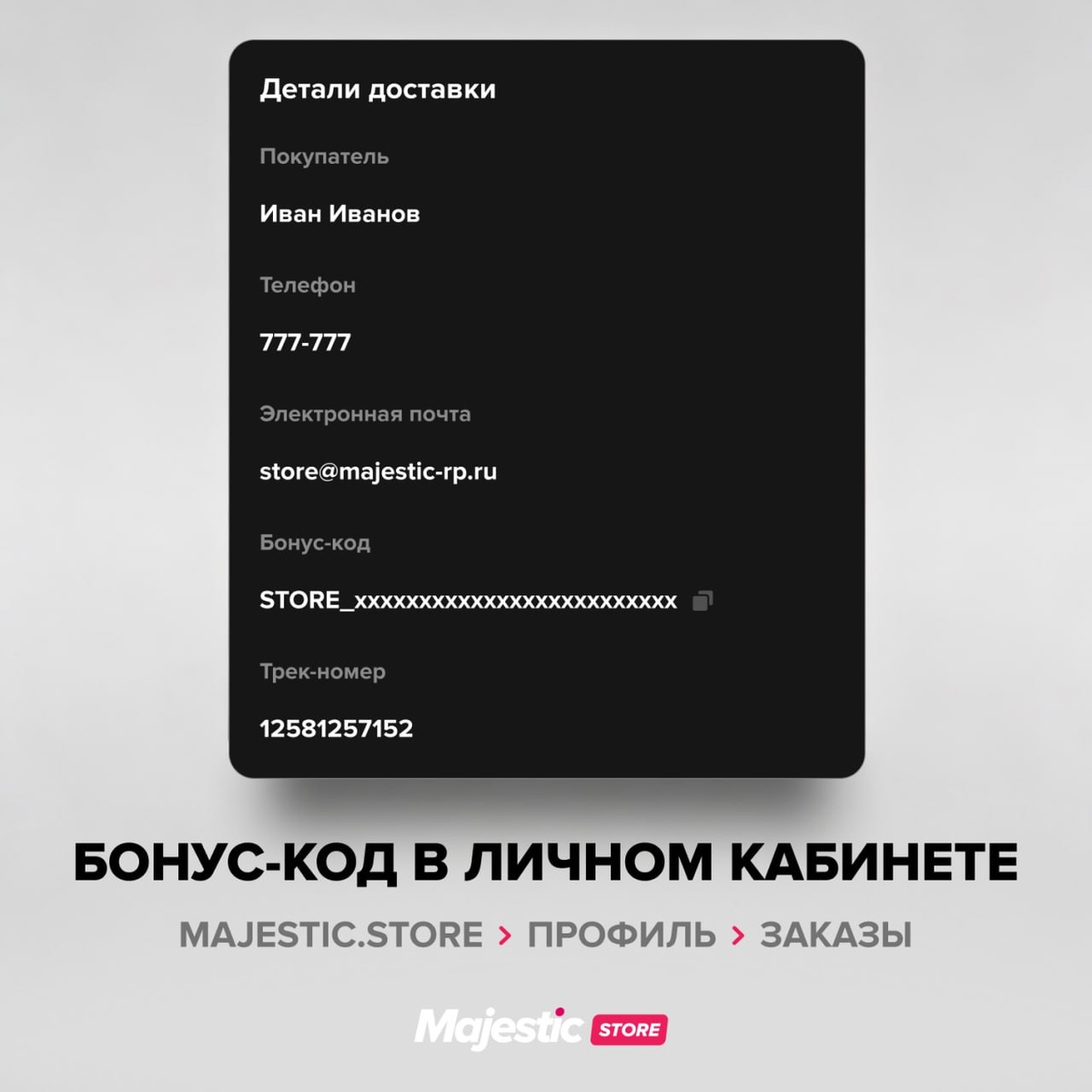 ΠΠ° ΡΠ°ΠΉΡΠ΅ Majestic Store Π² Π²Π°ΡΠ΅ΠΌ ΠΏΡΠΎΡΠΈΠ»Π΅ ΡΠΆΠ΅ Π΄ΠΎΡΡΡΠΏΠ΅Π½ Π±ΠΎΠ½ΡΡ-ΠΊΠΎΠ΄. ΠΠ³ΠΎ ΠΌΠΎΠΆΠ½ΠΎ Π½Π°ΠΉΡΠΈ Π² ΡΠ°Π·Π΄Π΅Π»Π΅ Β«ΠΠ°ΠΊΠ°Π·ΡΒ» β ΠΎΠ½ ΡΠΊΠ°Π·Π°Π½ Π² Π΄Π΅ΡΠ°Π»ΡΡ