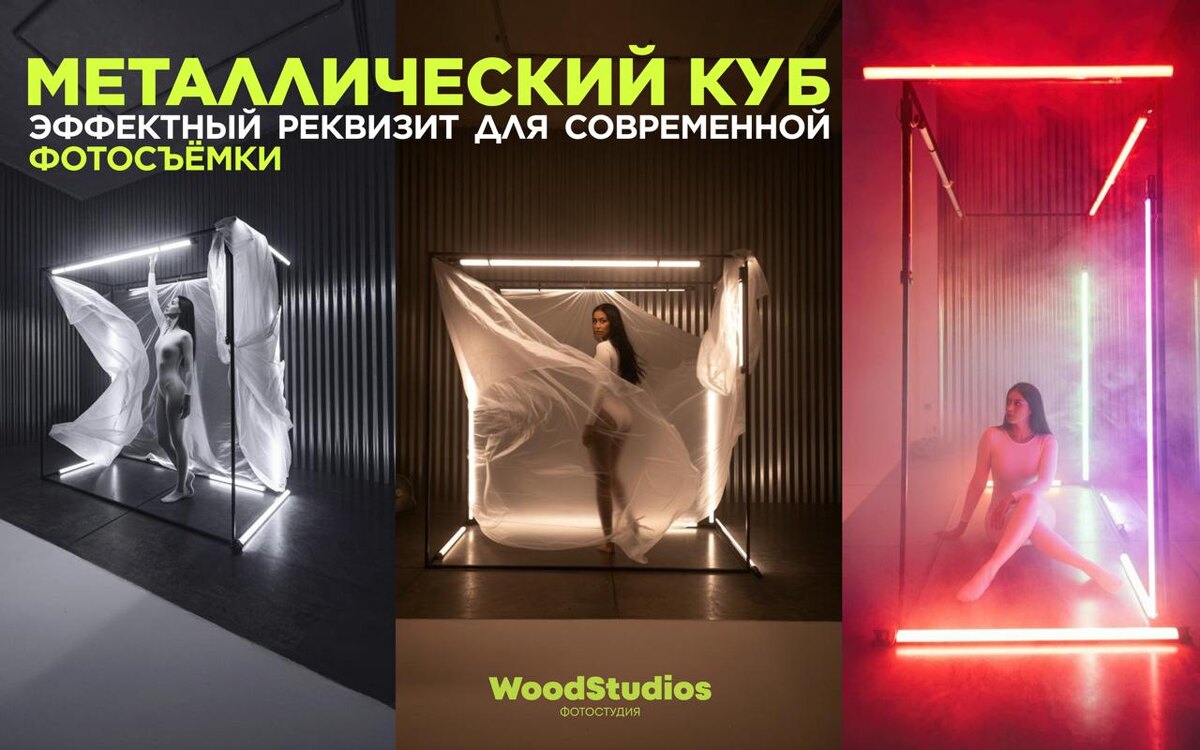 Он мгновенно притягивает внимание, формирует чёткую геометрию кадра и задаёт современное, арт-ориентированное настроение съёмки. Куб создаёт ощущение замкнутого пространства, рамки или сцены, внутри которой разворачивается история. Его строгая геометрия отлично контрастирует с пластикой человеческого тела, тканями и светом. Металлический каркас подчёркивает минимализм и индустриальный стиль, а открытая конструкция позволяет свободно работать с ракурсами и освещением. Одно из главных преимуществ металлического куба - это его функциональность. На конструкцию легко крепятся: световые палки; цветные и прозрачные плёнки; ткани и тюль; сотовый поликарбонат и другие рассеивающие материалы. Это даёт практически безграничные возможности для экспериментов со светом: от жёстких ярких акцентов до мягкого, обволакивающего свечения. Куб одинаково эффектно смотрится как в монохромных, так и в цветных схемах освещения. Смена света, позы или ткани внутри куба полностью меняет настроение кадра,