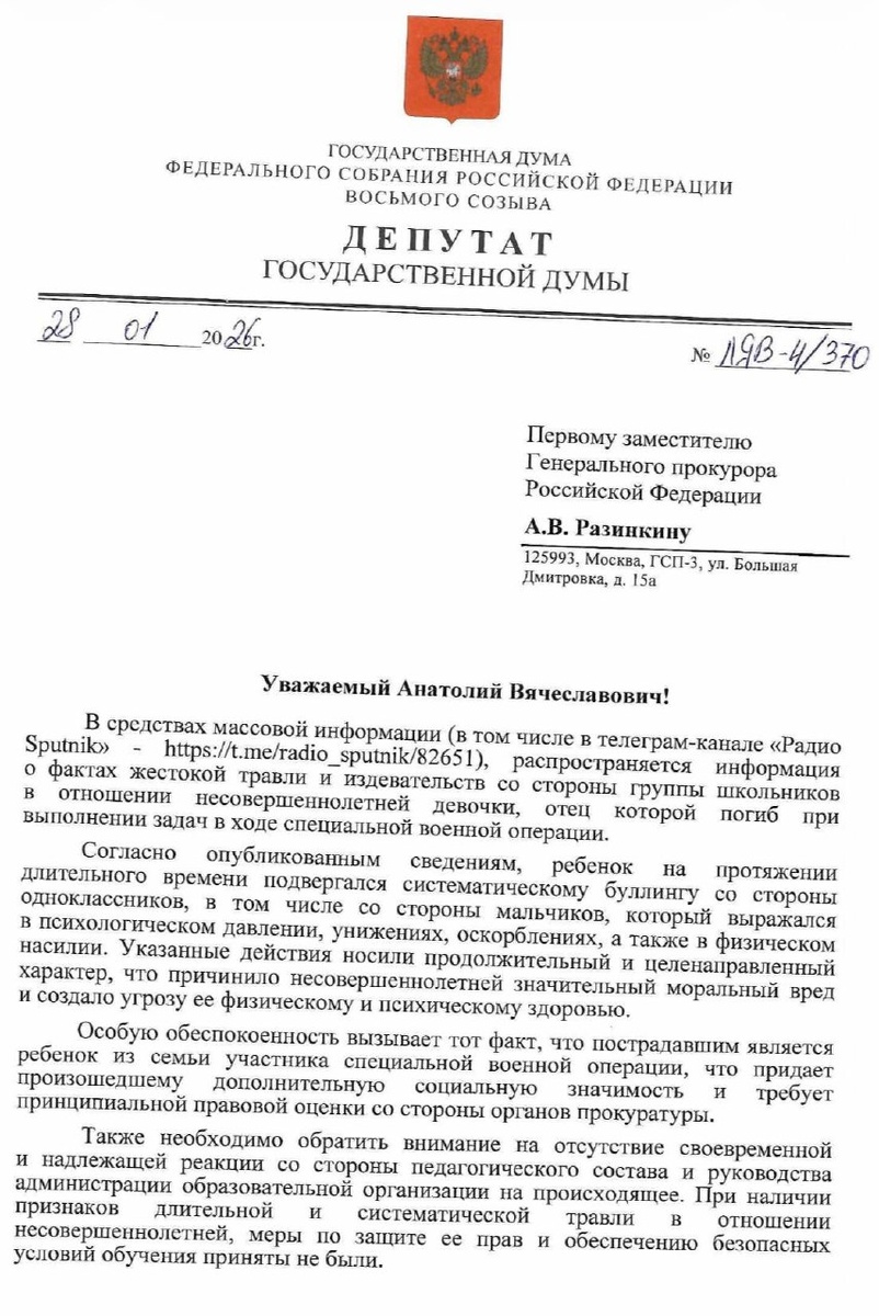 ❌В станице Ольгинской Ростовской области несовершеннолетние избили 12-летнюю девочку прямо в школе. В СМИ сообщается, что причиной нападения стала смерть ее отца в ходе спецоперации на Украине, подростки попытались обвинить ее в случившемся. ✉️То, что мы видим на видео, — это уже даже не травля, а нападение на ребенка, причем прямо в учебном заведении. Направила запрос в Генеральную прокуратуру с просьбой провести проверку по факту откровенных издевательств. Предстоит разобраться, почему педагоги и руководство школы не реагируют. Если это уже не первый случай, а системная травля, то ребенка необходимо защитить и принять строгие меры в отношении обидчиков. 📑Мы с коллегами разработали законопроект против травли, потому что нельзя больше закрывать глаза на масштабы этого явления. Увеличение числа случаев школьной травли вызывает серьезную тревогу в обществе. По данным опроса «Движения первых», в котором участвовали более 9,5 тыс. школьников, около 75% учащихся сталкивались с буллингом.