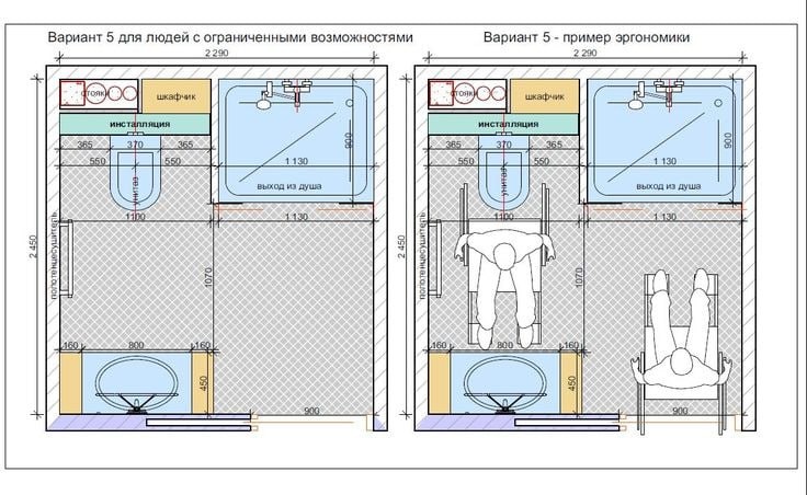 На изображении представлены два варианта планировки ванной комнаты с размерами 2,20 м на 2,90 м. для людей с ограниченными возможностями: - Ванная комната оборудована для удобства людей с ограниченными возможностями. - Справа от душа находится унитаз с поручнями. - Слева от душа расположен умывальник с зеркалом и шкафчиком для хранения. - В углу комнаты находится душевая кабина с поручнями. - На полу изображена плитка с противоскользящим покрытием. Пример эргономики: - Ванная комната оборудована с учетом эргономики и удобства использования. - Справа от душа находится унитаз с поручнями. - Слева от душа расположен умывальник с зеркалом и шкафчиком для хранения. - В углу комнаты находится душевая кабина с поручнями. - На полу плитка с противоскользящим покрытием. Планируйте правильно! #душеваяизстекланазаказ #стекляннаяперегородка #душеваяперегородка #душеваяперегородкаизстекла #ветроком