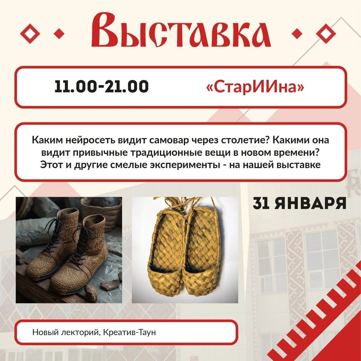 ! ✍️🎭Белгородский государственный центр народного творчества подарит вам целый день, наполненный атмосферой традиций, искусства и экспериментов: В программе: 🕚 11:00–21:00 🖼 Выставка «СтарИИна» 👉 Запись: https://forms.yandex.ru/u/6978d69c90fa7b36938db1ee/ 🕚 11:00–13:00 🎨 Мастер-класс «Игогошечка» 👉 Запись: https://forms.yandex.ru/u/6978d788505690c9affffb22/ 🕒 15:00–16:00 👑 Мастер-класс «Девицам на выданье» 👉 Запись: https://forms.yandex.ru/u/6978d8356d2d73da1b0b6206/ 🕓 16:00–17:00 🎶 Белгородский песенный словарь «Не Даль» 👉 Запись: https://forms.yandex.ru/u/6978d870493639134f5b4d92/ 🕕 18:00–20:00 🎭 Этноспектакль «Порушка-Белогорушка» 👉 Запись: https://forms.yandex.ru/u/6978d8a090fa7b36318db2a5/ 🕗 20:00–21:00 🎤 Музыкальная битва «Распознай мотив» 👉 Запись: https://forms.yandex.ru/u/6978d8d6eb61461c942a28e7/ 📌 Проведите день в ритме народного творчества — ярко, современно и по-настоящему!