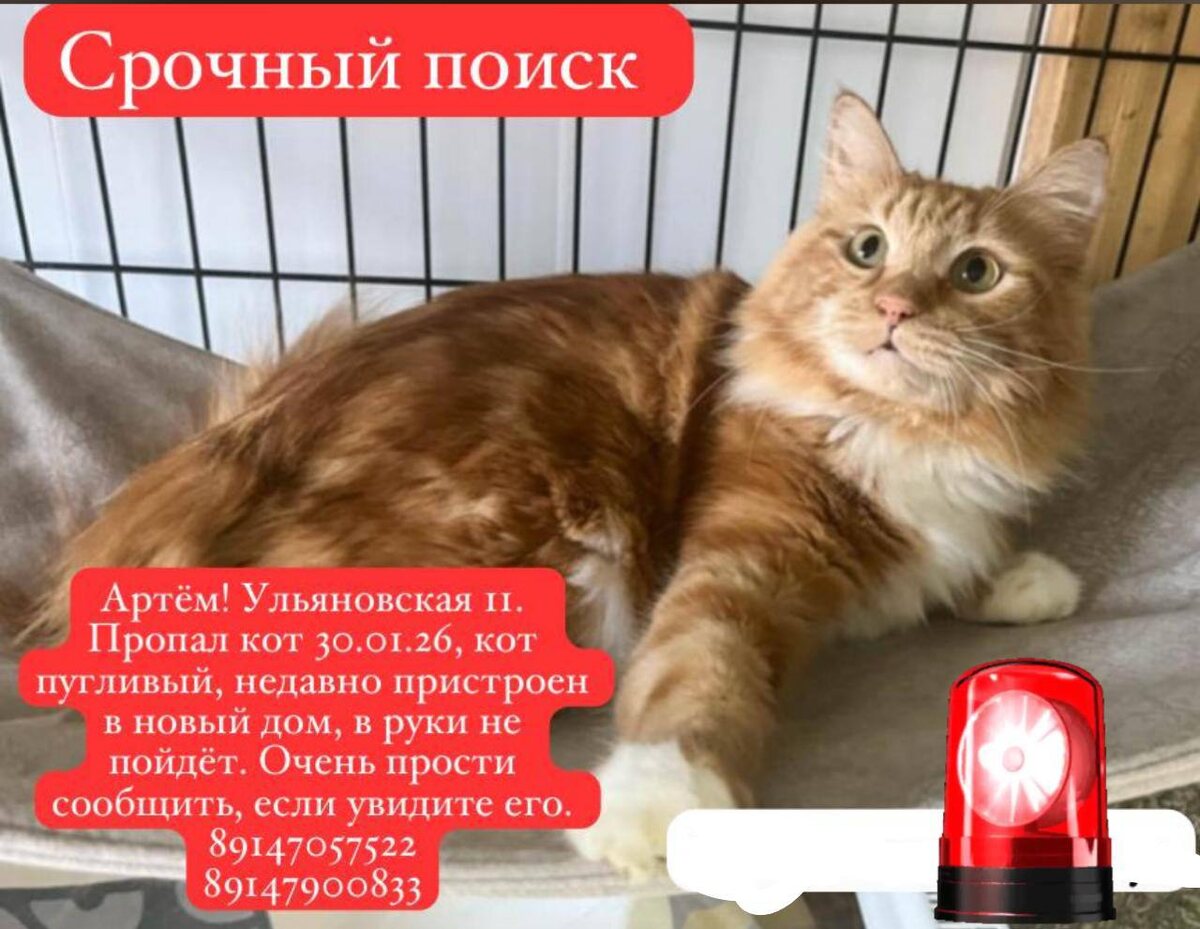 Артём! Ульяновская 11. Пропал кот 30.01.26, кот пугливый, недавно пристроен в новый дом, в руки не пойдёт. Очень прости сообщить, если увидите его.