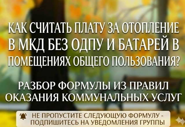1️⃣Когда применяется формула: отопление при отсутствии ОДПУ в течение отопительного периода (пункт 2(3-1) приложения 2 к постановлению Правительства от 06.05.2011 №354). 2️⃣Когда НЕ применяется формула: 1) в жилом («частном») доме; 2) в МКД, в котором есть ОДПУ. 3️⃣В каких помещениях применяется: жилые и нежилые помещения многоквартирного дома. 4️⃣Условие применения: 1) в многоквартирном доме нет ОДПУ; 2) во всех помещениях общего пользования МКД нет приборов отопления, то есть помещения общего пользования не отапливаются; 3) оплата в течение отопительного периода. 5️⃣Какие данные нужны для расчета: 1) общая площадь жилого или нежилого помещения; 2) норматив потребления отопления для жилого, нежилого помещения; 3) тариф на тепловую энергию. 6️⃣Где взять данные: 1) общая площадь указывается в документах о праве собственности на жилой дом, в выписке из ЕГРН (приложение 1 к приказу Росреестра от 04.09.2020 № П/0329); 2) норматив потребления можно узнать на сайте органа тарифного регулиров