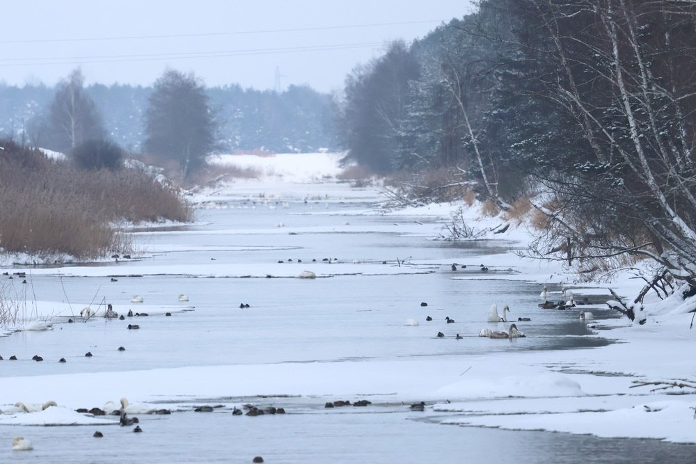 🏷На незамерзающем участке реки Вислица в окрестностях деревни Вяз от морозов спасаются лебеди и утки