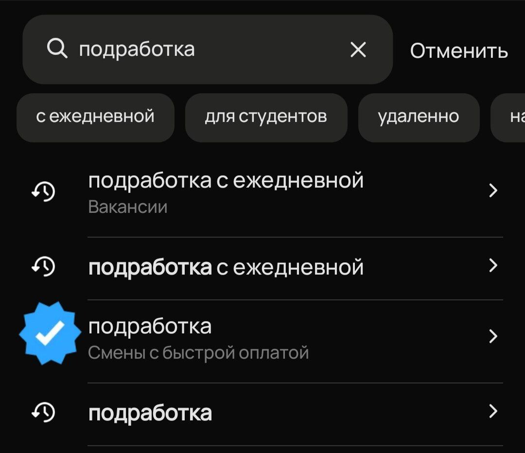 В поиске пишете «подработка» — тебя интересуют смены с быстрой оплатой (не ежедневной, а именно быстрой)