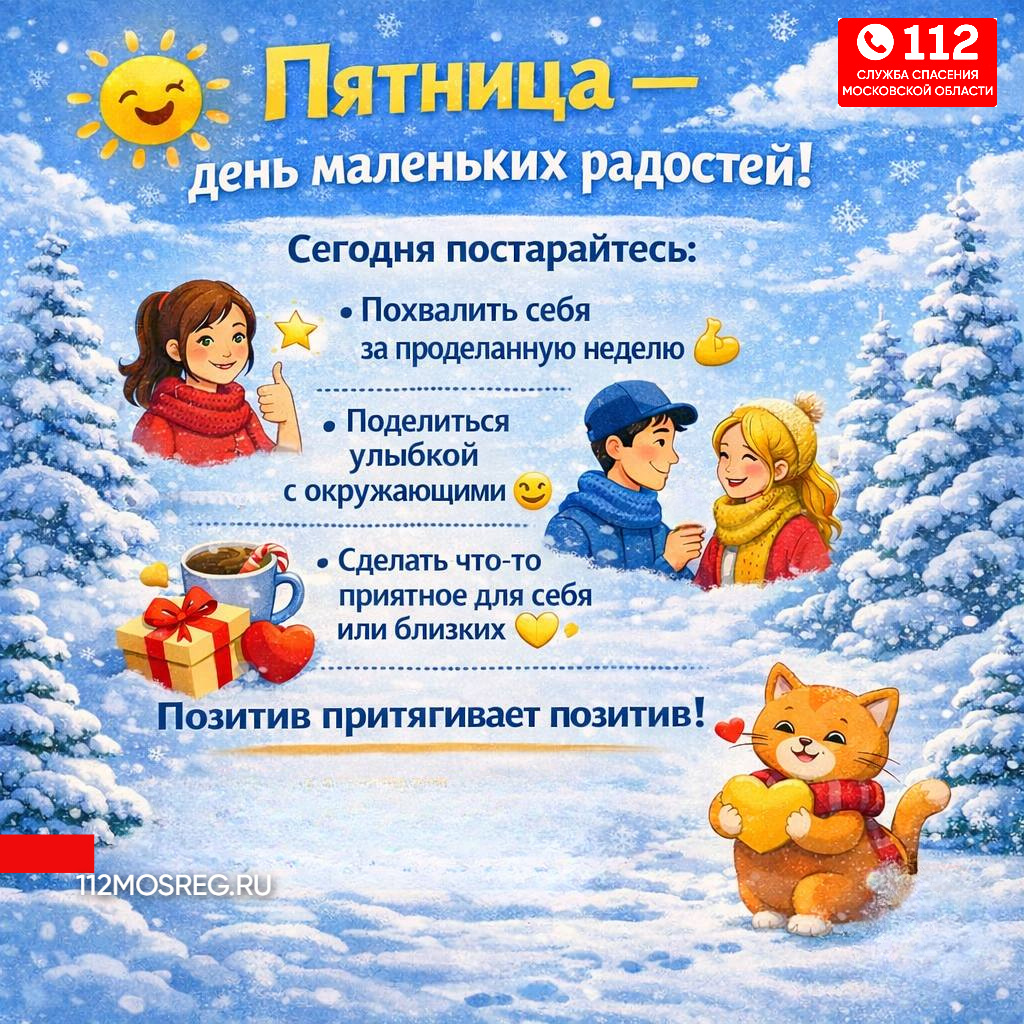 Пятница — это повод остановиться и порадоваться мелочам Похвалите себя за эту неделю, подарите кому-нибудь улыбку и сделайте что-то тёплое для себя или близких Пусть зимний день станет чуточку светлее — позитив всегда возвращается А если понадобится помощь — Система-112 Московской области всегда на связи!