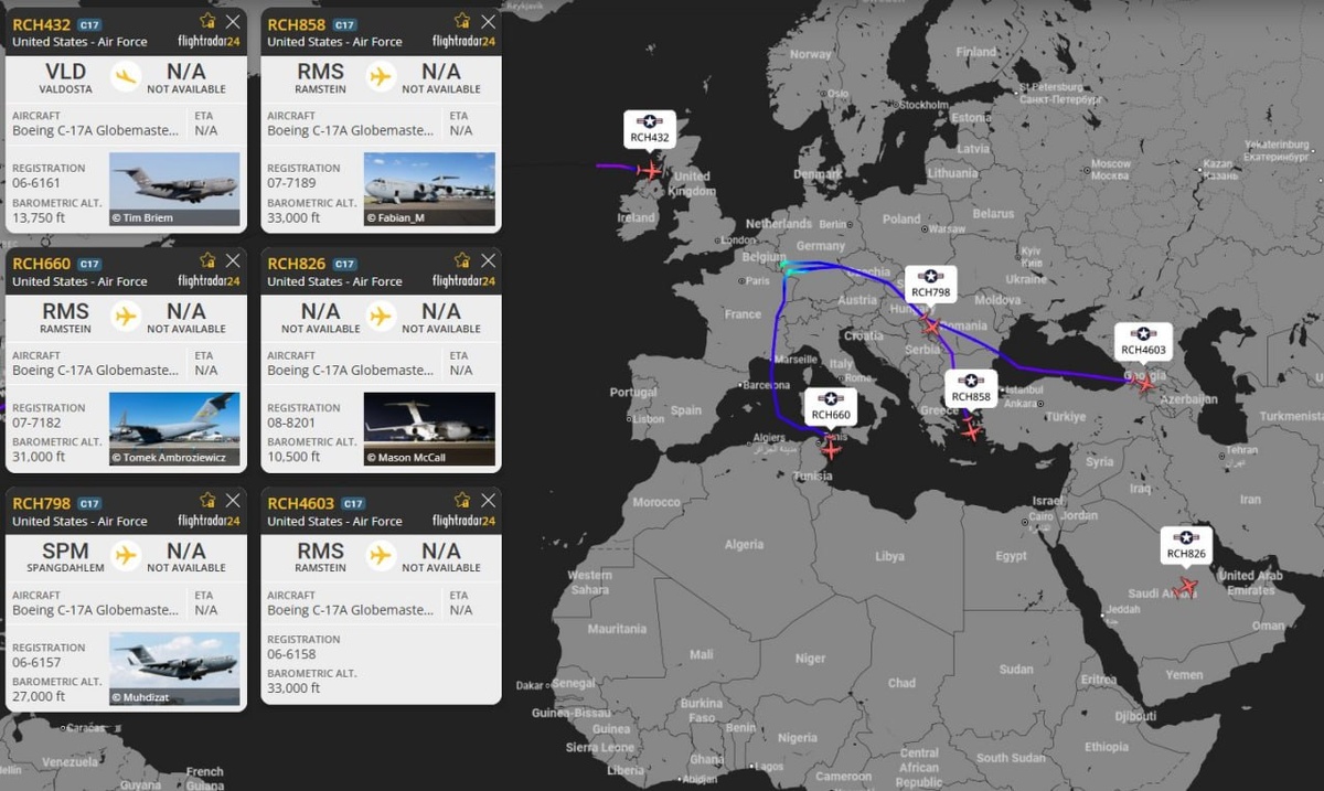 Очередные партии транспортников C-17 Globemaster III и заправщиков KC-135 Stratotanker ВВС США отправились из Европы на Ближний Восток. С каждым днем сосредоточенный наряд сил и средств для операции против Ирана становится все больше. #Иран Военный Осведомитель