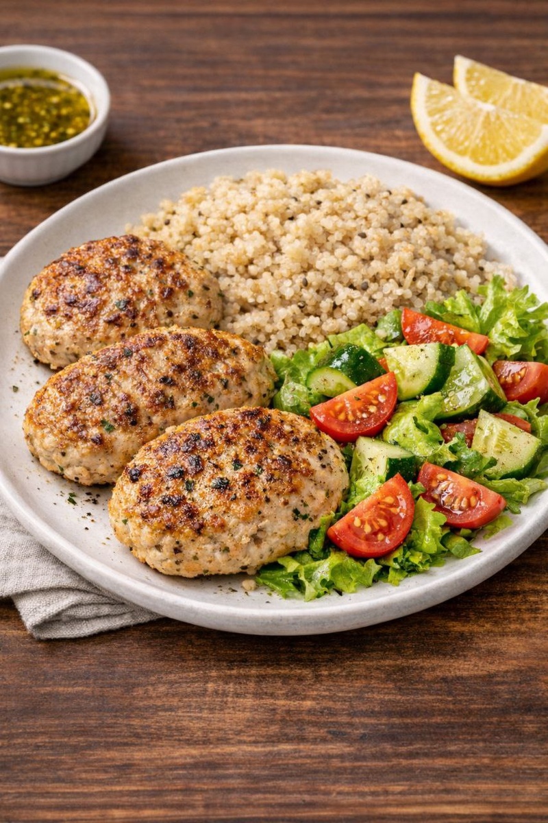 ⏱ Время приготовления: 20 минут Ингредиенты: · Куриное филе — 150 г · Яйцо — 1 шт. · Киноа (сухая) — 60 г · Огурец, помидор, листья салата — по горсти · Лимонный сок, оливковое масло — для заправки · Соль, перец, специи по вкусу Приготовление: 1️⃣ Котлеты: Филе измельчите в фарш. Добавьте яйцо, соль, перец, любимые травы (паприка, прованские травы отлично подойдут). Сформируйте котлеты. 2️⃣ Готовим: Обжарьте на сухой антипригарной сковороде по 4-5 минут с каждой стороны до золотистой корочки. Или запеките в духовке при 180°C 15-20 минут. 3️⃣ Гарнир: Киноа промойте, залейте водой 1:2 и варите 15 минут после закипания. Выключите и дайте постоять под крышкой. 4️⃣ Салат: Нарежьте овощи. Сбрызните смесью лимонного сока и ½ ч.л. оливкового масла. 📊 КБЖУ на порцию: · ~ 450 ккал · Белки: 42 г 🥚 · Жиры: 12 г 🥑 · Углеводы: 40 г 🌾 #обед #ппрецепт #киноа #похудение #фитнесрецепты
