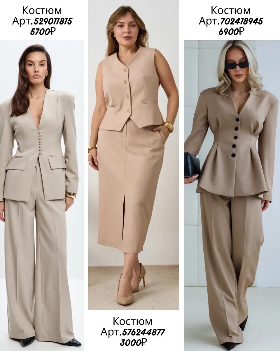 Есть вещи, которые работают как «рамка» для образа: надеваешь — и сразу появляется осанка, чёткая линия плеч, талия на месте, шаг увереннее. В этой подборке именно такие находки: костюмы, где важна каждая деталь — от формы лацканов до расположения пуговиц и правильной длины низа. Я разберу каждую модель по порядку, с артикулами и ценами, и добавлю советы стилиста, чтобы покупка действительно стала частью гардероба, а не разовым выходом.