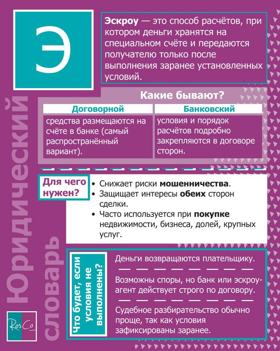 Эскроу — это способ расчётов, при котором деньги хранятся на специальном счёте и передаются получателю только после выполнения заранее установленных условий. 📄 Какие бывают? 🔸 Банковский эскроу — средства размещаются на счёте в банке (самый распространённый вариант). 🔸 Договорной эскроу — условия и порядок расчётов подробно закрепляются в договоре сторон. 💼 Для чего нужен? 🔸 Защищает интересы обеих сторон сделки. 🔸 Снижает риск мошенничества. 🔸 Часто используется при покупке недвижимости, бизнеса, долей, крупных услуг. ⚖️ Особенности: 🔸 Деньги «заморожены» до выполнения условий (передачи имущества, регистрации права и т.д.). 🔸 Ни одна из сторон не может распоряжаться средствами до наступления оговорённых событий. 🔸 Условия раскрытия средств должны быть чётко прописаны. 🔎 Что будет, если условия не выполнены? 🔸 Деньги возвращаются плательщику. 🔸 Возможны споры, но банк или эскроу-агент действует строго по договору. 🔸 Судебное разбирательство обычно проще, так как услов