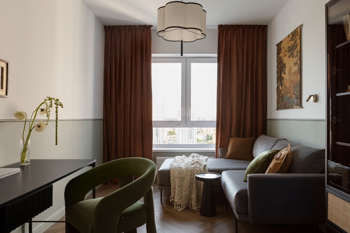 Шалфей, сливочно-бежевый и терракота — палитра этого интерьера состоит из трендовых натуральных тонов. Современная эклектика дополнена французскими и ретроэлементами, а индивидуальность создается за счет арт-деталей ручной работы. Заглянем в гости. Объект: двухкомнатная квартира 55 кв.м в ЖК «Екатерининский парк», г. Екатеринбург (потолки 2,7 м) Авторы проекта: дизайнеры Анастасия Гавриленко и Анастасия Камаева Автор фото: Татьяна Ульянова Бюджет: 3 млн рублей Квартира сдавалась со стандартной планировкой. Здесь две комнаты: многофункциональная гостиная-кабинет и спальня, а также изолированная кухня. Санузел совмещенный. В прихожей была предусмотрена ниша для хранения. В гостиной стены «разделили» горизонтальным молдингом и цветом: низ — в шалфейном, верх и потолок — в белом оттенках. Панорамное окно впускает в комнату максимум дневного света. Мебель для гостиной: угловой диван Мисл, витрина Бронте, рабочий стол Тирон и журнальный стол Джейми подобрана из коллекций divan.ru. Для нас di