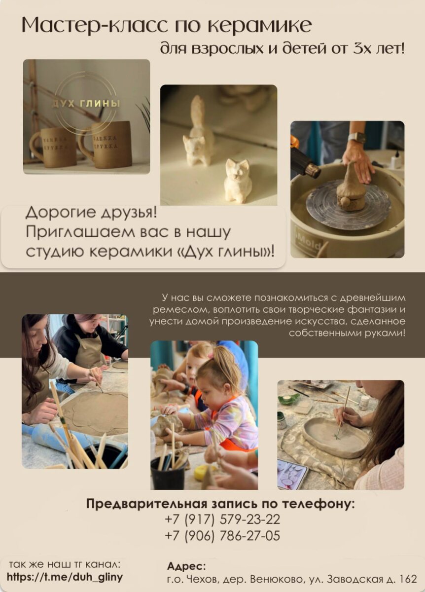 ! Приглашаем вас посетить мастер-класс по ручной лепке из глины и занятия на гончарном круге для взрослых и детей от 3х лет! 🎉🎉 Что входит в мастер-класс? 1. Занятие лепкой за столом под руководством нашего мастера в группах до шести человек 2.Парные занятия на гончарном круге 3. Изготовление 1-2 изделий (зависит от сложности) 4. Покрытие изделий цветными красками (ангобами). 5.Продолжительность МК 1,5 часа 6. Уютная атмосфера (чай/кофе, хорошая музыка и домашняя обстановка ) Предварительная запись по телефону: 8 (917) 579-23-22, +7 (906) 786-27-05, Адрес: г.о. Чехов, дер. Венюково, ул. Заводская д. 162