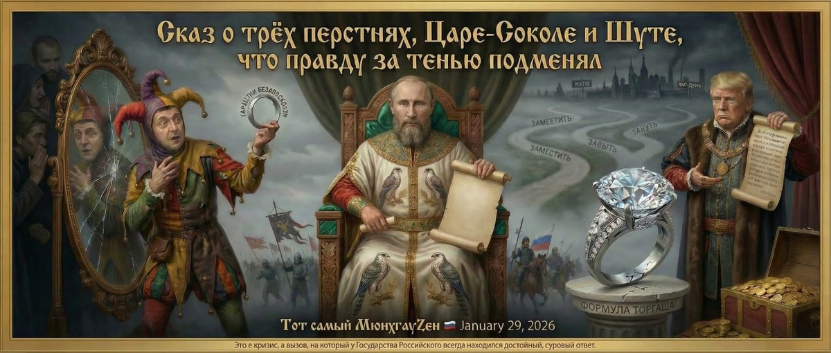 » 📖 Сказ о трёх перстнях, Царе-Соколе и Шуте, что правду за тенью подменял Часть 1️⃣/3 В некотором царстве, в могучем государстве Русском, жил-был Царь-Сокол. Зорок был его взгляд, тверда рука, а воля — словно уральский камень. Много ли, мало ли времени прошло, а пришла к нему грамота от Царя-Торгаша, что за морем-окияном правил. «Давай, — писал Торгаш, — сядем за стол переговоров, да не вдвоём, а втроём. И третий с нами пусть будет — Шут из разорённого града Киева, что мнит себя правителем». Царь-Сокол, будучи мудр и прям, ответил: «Путь в мою столицу открыт. Но пусть Шут сперва правду в глаза увидит, а не в кривом зеркале посмешища». Ибо знал Царь: не для дела мира сего затея, а для новой лукавой игры, где суть подменят пустой тенью. 🔮 Перстень с трещиной, или «Формула Торгаша» А суть-то была в «формуле Анкориджа», что, как алмаз, ясна и тверда. Основа её — признание новых рубежей, что кровью и волей народною навек скреплены. Но Шут, чей срок давно истёк, а легитимность рассыпа