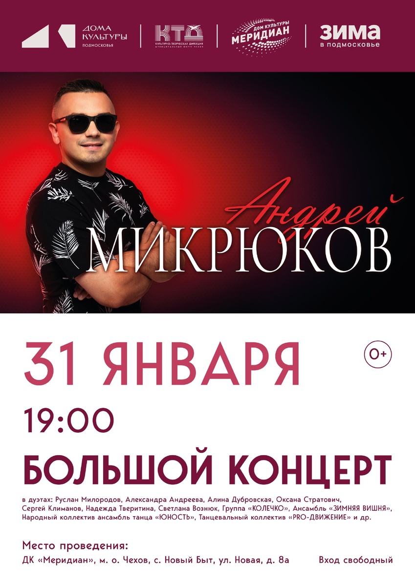 ✨ Бесплатный концерт Андрея Микрюкова в селе Новый Быт Помимо того, что Андрей будет выступать сольно на сцене🎤, он обязательно споет в дуэтах со многими артистами, такими как:👉 Александра Андреева, Алина Дубровская, Оксана Стратович, Руслан Милородов, Светлана Вознюк и другими. 🎹Выступит с музыкальными группами. А танцевальное настроение 💃 добавит ансамбль танца "Юность" и танцевальный коллектив «PRO-Движение». 🔥Это будет музыкальный праздник с любимыми песнями и танцами. 🚫 Возраст: 0+ 📆 31.01.2026 🕛 19:00 🏢 ДК «Меридиан» 📍 г.о. Чехов, с. Новый Быт, ул. Новая, д.8а 🪙 Вход свободный❗️ ⭐Поддержать канал голосом ✅ Мероприятия Чехов https://dzen.ru/id/66cc4b48e9ef144699238a51 http://vk.com/chekhov_events http://dzen.ru/chekhov_events