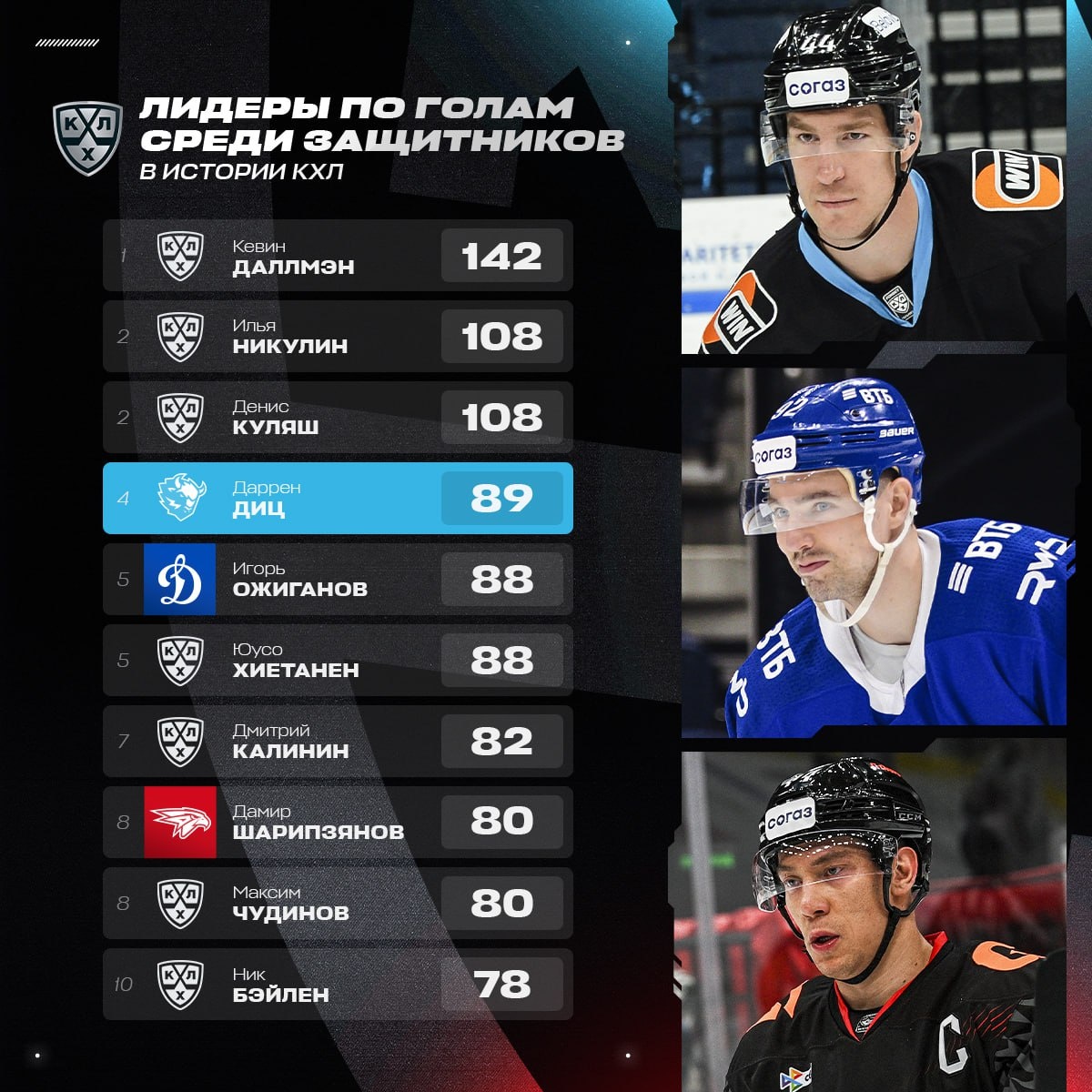 Первый гол Даррена Дица 🦬 в сезоне открыл новый этап соперничества с Игорем Ожигановым 🔵 в рейтинге защитников-бомбардиров в истории КХЛ.