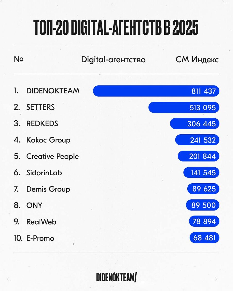 ! 🎁 Друзья и коллеги, не терпится поделиться с вами еще одним важным для нас достижением 🔥 Мы снова забрали 1 место в рейтинге СМ-индекс от «Медиалогии» среди digital-агентств. А главное, что есть сильная динамика по сравнению с прошлым годом, — наш показатель увеличился в 1,5 раза! Полный газ! 🫡 #DTeam 💚 Подписаться на DIDENOK TEAM