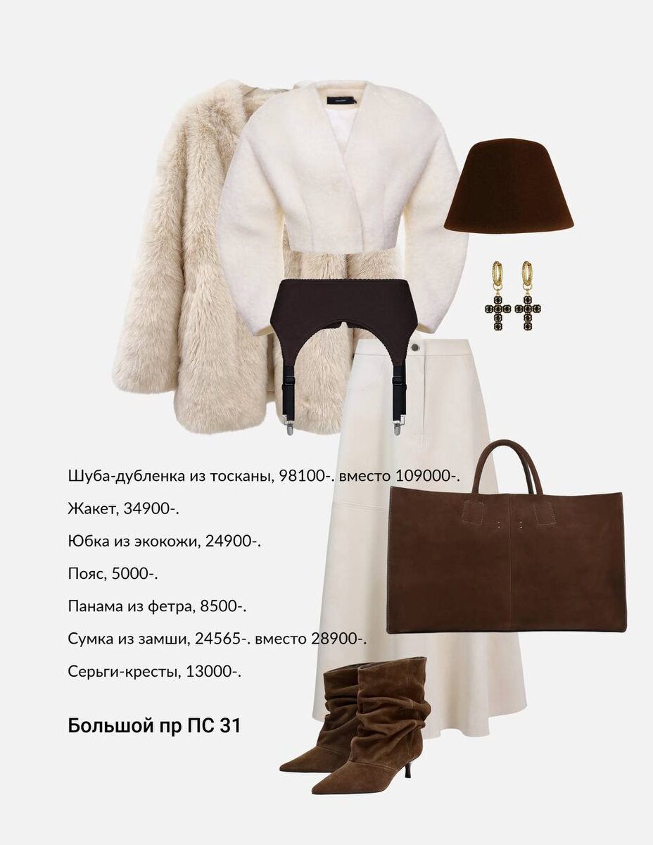собрали для вас образ с новинками и скидками — дерзкий и дорого выглядящий за счет благородных фактур и тканей Шуба-дубленка из натурального меха тосканы, 98100₽ вместо 109000₽ скидка на последний экземпляр, больше не будет! Жакет (хит!), 34900₽ Юбка из премиальной экокожи, 24900₽ Пояс с подвязками ( новинка, хит!), 5000₽ Сумка-тоут из замши (хит!), 24565₽ вместо 28900₽ скидка на последний экземпляр, больше не будет Панама из фетра, 8500₽ Серьги-кресты с черными фианитами, 13000₽ ____________ Maker, Большой пр ПС 31 Друзья, почти все модели остались в единственном экземпляре — потом будут раскуплены или недоступны! Резерв не делаем, но можем отвесить-отложить на 1-1,5 часа если напишете нам в MakerBot