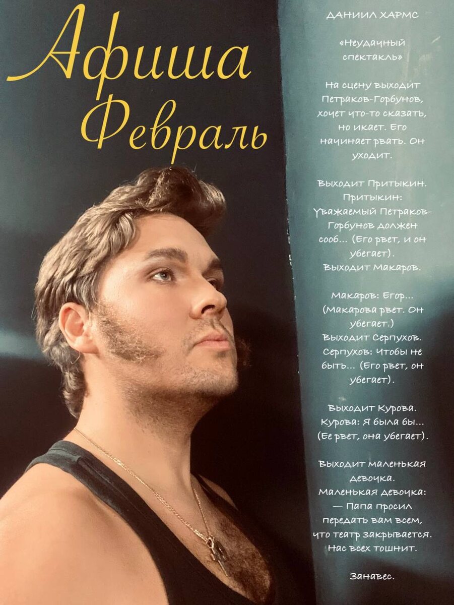 » Театр «Поколение» 1 февраля «Ромео и Джульетта »⌚️18:00 5 февраля «Дубровский»⌚️19:00 7 февраля «Приключения Тома Сойера»⌚️14:00 «Человек-Амфибия »⌚️19:00 8 февраля «Колобок»⌚️11:00 «Алые Паруса» ⌚️18:00 12 февраля «Дубровский»⌚️19:00 14 февраля «Теремок» ⌚️11:00 «Ромео и Джульетта »⌚️18:00 15 февраля «Золушка» ⌚️12:00 «Дубровский» ⌚️18:00 19 февраля «Алые Паруса» ⌚️19:00 20 февраля «Дубровский» ⌚️19:00 22 февраля «Красная Шапочка»⌚️12:00 23 февраля «Севастопольский вальс» ⌚️18:00 27 февраля «Дубровский» ⌚️19:00 28 февраля «Приключения Тома Сойера»⌚️12:00 «Современный театр Мюзикла» на сцене Московского Драматического Театра им. Н.В.Гоголя 21 февраля «Приключения Тома Сойера»⌚️11:00 Театр «Буфф-Парадиз» 3 февраля «Покровские Ворота» Дк «Газ» г. Нижний Новгород⌚️19:00 13 февраля «Покровские ворота» Дк им.Солдатова г. Пермь ⌚️19:00 25 февраля «Покровские ворота» Дк Машиностроитель г. Петрозаводск ⌚️19:00 «Изменения в афише возможны, но необязательны.»