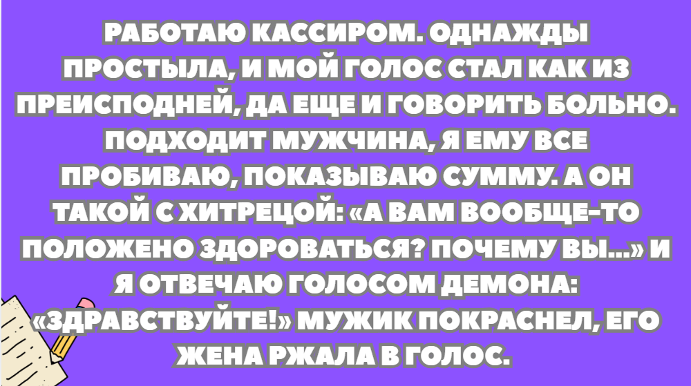 - Работаю кассиром. Вчера в магазин зашла женщина с кастрюлей супа. Говорит, что я продала ей испорченную тушенку и суп ей испортила, выливает его мне на прилавок. Однако тушенка была свежая. На следующий день ко мне заявляется мужчина, просит пропустить без очереди, а то жена домой не пустит. Сказал, что она тут тушенку вчера просроченную купила. Говорю ему: «С такой женой вас всегда без очереди пропускать надо».