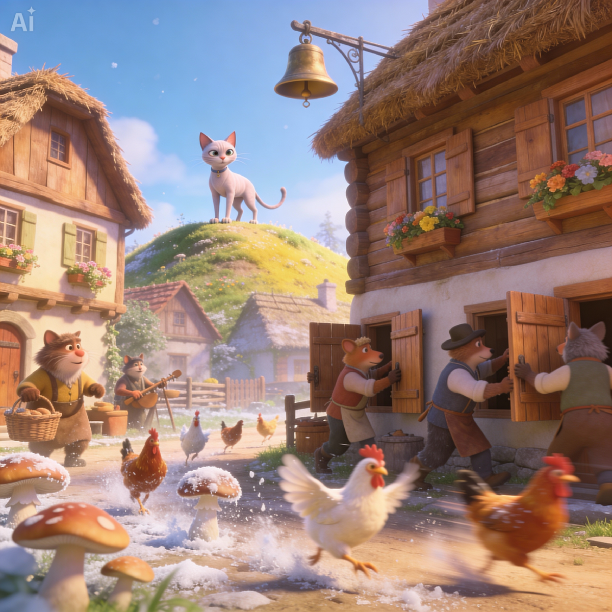 Как только лысый кот показался на пригорке, колокол у пекарни сам по себе звякнул. Куры разбежались, лисички сделали вид, что их вообще нет, а ремесленники синхронно захлопнули ставни.