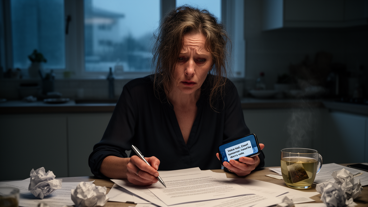Она написала начальнице сообщение, что берёт отгул по болезни. Потом — юристу, который помогал ей составлять документы: «Утром потеряла голос. Завтра заседание. Что делать?» Юрист ответил быстро: «Не шептать. Письменно можно. Если совсем нет голоса, можно ходатайство о переносе, но суд может не перенести. Я буду рядом».