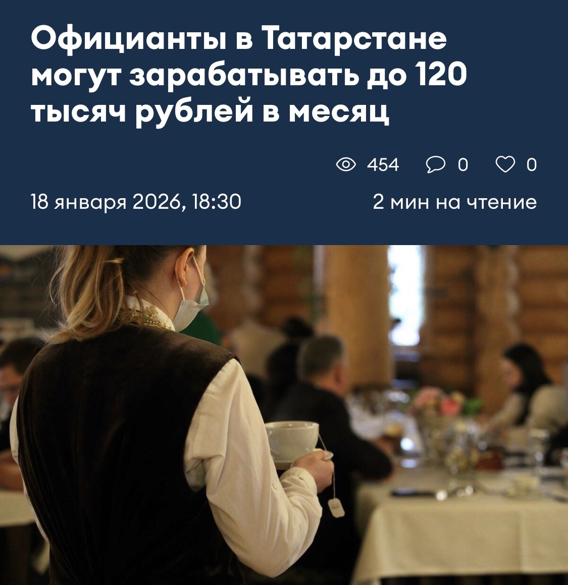 Кому интересно - вот ссылка на первоистощник, там можете узнать и о росте средней зарплаты на сколько-то %, а я тут кратко: некий HR-эксперт по-экспертному сообщает, что официанты, вот тут внимание, могут рассчитывать на высокий доход, если работают в востребованном заведении; а с учётом чаевых и сезонных январских бонусов, вот тут особое внимание, официантские доходы могут достигать аж ста двадцати тысяч рублей.