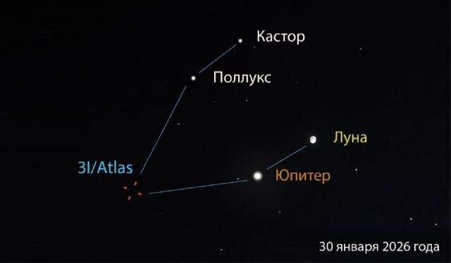 Прежде всего, это Луна и Юпитер, который сейчас является самой яркой «звездой» на небосводе. Они находятся всего в нескольких градусах друг от друга. Над ними сияют две ярчайшие звезды из созвездия Близнецов — Кастор и Поллукс. Вершину этого созвездия и образует комета. По информации сотрудников Лаборатории солнечной астрономии ИКИ РАН, увидеть комету невооружённым глазом или даже с помощью доступного телескопа невозможно. Однако при помощи специальнойоптики на чистом небе можно наблюдать рядом Луну и Юпитер. Эта композиция будет видна по всей стране в течение всей ночи. После 4 часов утра по местному времени Луна опустится к горизонту, и наблюдать её станет сложнее.