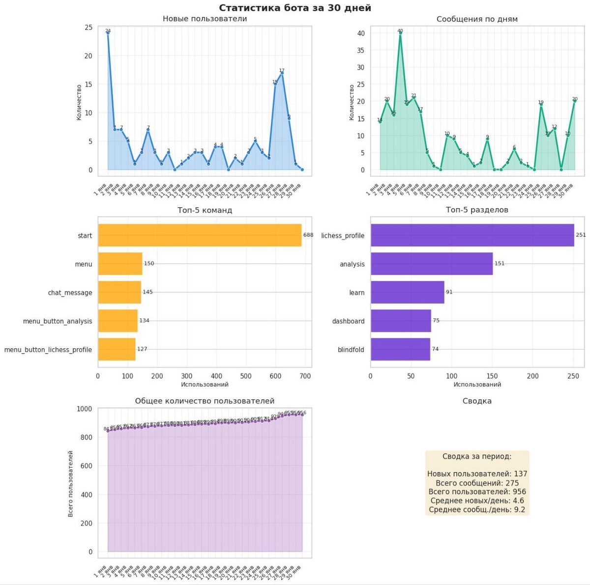 ! За последние 30 дней: 🚀 +137 новых игроков 👥 956 всего 💬 275 сообщений (≈9/день) 🌍 География расширяется: ru / en / uz / uk / it / fr 🔥 Топ‑разделы: Lichess Profile · Analysis · Learn · Dashboard · Blindfold Спасибо каждому, кто тестит, делится и кидает фидбек. Если ещё не пробовали — самое время зайти: @CHESS_and_LESSONS_bot 🚀