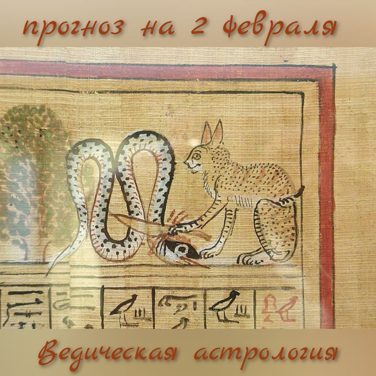 *на изображении - часть древнеегипетского папируса, где бог творец в образе рыжего кота побеждает змея-олицетворение хаоса.