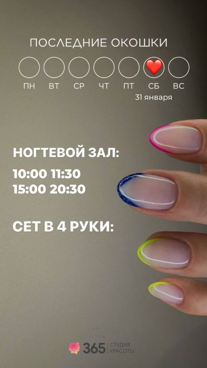 💞 Приходите насладиться нашими услугами и прекрасно отдохнуть в студии 365 💞💫 Пусть ваши выходные будут яркими и расслабляющими! 🩷 Мы ждем Вас! 💫 #красота #наслаждение #забота #зима #любовь #мечты сбываются #радость #возможности ЧТО МОЖНО УСПЕТЬ СДЕЛАТЬ 31 января 2026 года : Ногтевой зал: 10:00 11:30 15:00 20:30 Сет в 4 руки: ❌ Парикмахерский зал: 10:00 13:00 18:00 20:00 Оформление бровей и ресниц: ближайшая запись на 5 февраля Косметология/шугаринг: ближайшая запись на 04 февраля ЗАПИСАТЬСЯ МОЖНО ЛЮБЫМ УДОБНЫМ СПОСОБОМ: 👉🏻 Сообщение в Whats'app https://wa.me/79663654477 👉🏻По телефону +79663654477 👉🏻Онлайн запись https://n286444.yclients.com/ #команда365 #красота #наслаждение #забота #зима #январь #любовь #мечтысбываются #радость #возможности