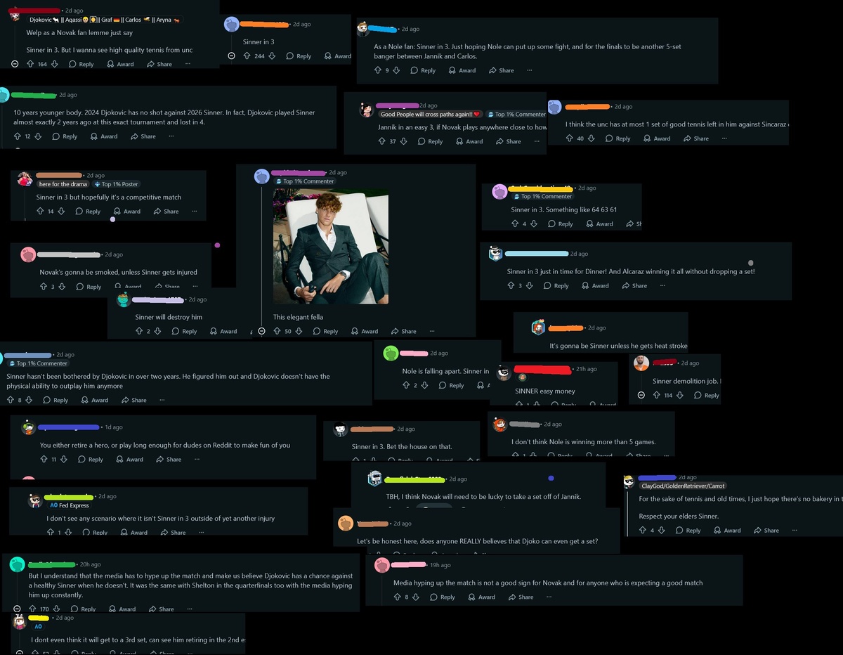 Тут реддиторы перед матчем Синнер - Джокович предсказывали победителя