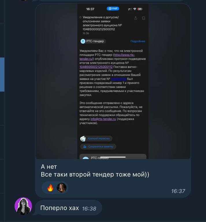 Для многих первый выигранный контракт происходит неожиданно, и это всегда самые искренние эмоции! Прикрепила пару сообщений, которые пишут нам в личку) Это привычная ситуация в нашей онлайн-школе. Ученики идут по инструкции, которую мы даем, просто делают, а потом удивляются, как легко и быстро можно выиграть первый тендер Кто-то побеждает через неделю, кто-то — через месяц, но в итоге каждый выигрывает первый контракт и получает первую прибыль: от 5.000р до 100.000р за первый месяц Когда-то наши ученики также, как и многие из вас сейчас, ничего не знали о госзакупках. А теперь — выигрывают свои контракты и получают прибыль И мы точно знаем, что так может каждый 🔥
