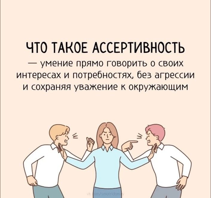 Сегодня об «отстаивании границ» говорят на каждом углу. Но мало кто объясняет, как делать это достойно, не превращаясь в агрессора и не уходя в глухую оборону. Есть золотая середина — это ассертивность - умение твердо заявить о своих интересах, сохранив при этом глубокое уважение и к себе, и к собеседнику. Как это выглядит в жизни? Представьте, что в ресторане вам принесли не тот заказ. • Пассивный путь: промолчать, вежливо улыбнуться и съесть то, что не нравится, лишь бы не быть «проблемным» клиентом. • Агрессивный путь: устроить скандал, обвинить официанта в некомпетентности и испортить вечер всем вокруг. • Ассертивный путь: спокойно и уверенно сказать: «Простите, я заказывал другой салат. Пожалуйста, замените его». Ассертивность — это не только слова. Это ваш внутренний фундамент, который проявляется через: ✅ Ощущение внутренней опоры; ✅ Расслабленное тело (без зажимов и готовности к атаке); ✅ Ровный, спокойный тон голоса; ✅ Прямое и честное изложение своих мыслей; ✅ Четкое по