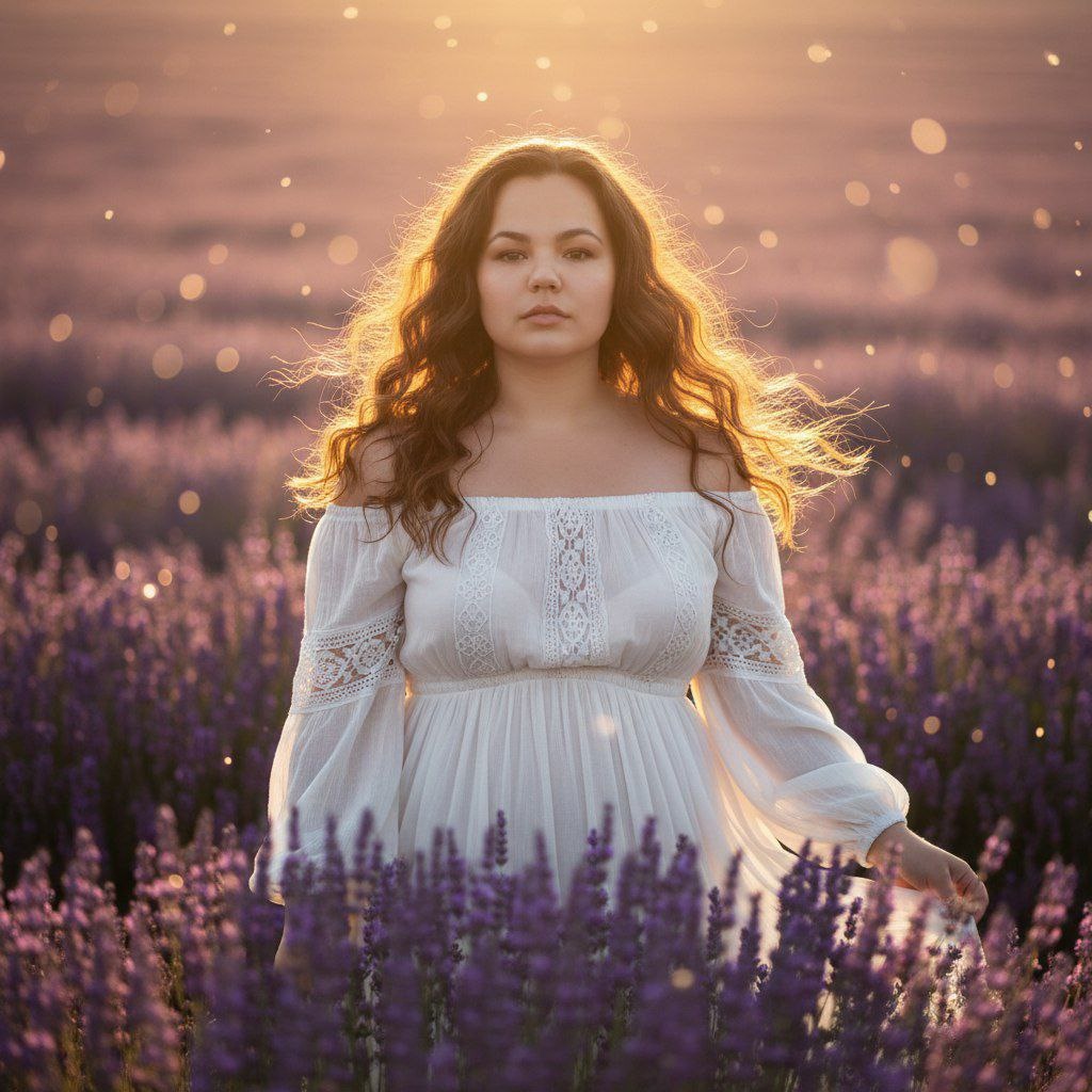 😀Выбираем "нейросети" 😀Нажимаем "Nano Banana" 😀Нажимаем "Nano Banana Pro" 😀Прикрепляем через скрепку свое фото и выбранный промпт 😀Наслаждаемся результатом😍 Создай фото не меняя черты лица и цвет волос. Фотореалистичный поясной портрет в поле лаванды во время золотого часа. Волнистые волосы в свободных локонах, лёгкий ветер играет прядями, мягкая тёплая контровая подсветка и рим‑лайт, золотое сияние по краям волос. Одежда: воздушное белое платье в бохо‑стиле с кружевной отделкой и открытыми плечами, детализированная текстура ткани. Состав: глубокая малая глубина резкости (f/1.8), 85mm портретный объектив, мягкое боке, передний план с размытыми стеблями лаванды, фокус на верхней части торса и платье. Цветовая палитра: пастельно‑фиолетовые оттенки лаванды и тёплые золотые тона, объёмный свет, лёгкий солнечный блик/ленз‑флер. Стиль: романтичный, мечтательный, кинематографическая цветокоррекция, высокая детализация волос и ткани, мягкие естественные тона кожи. Негативные ключевые с