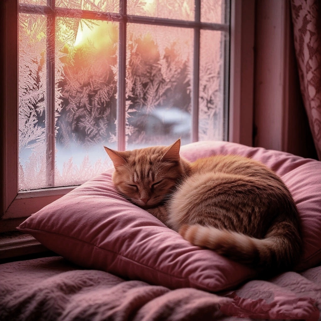 Раннее утро окрасило в розовый цвет разрисованные морозом окна. Пьяска проснулась, открыла глаза, а кот, который сидел у её головы сразу начал громко мурчать.