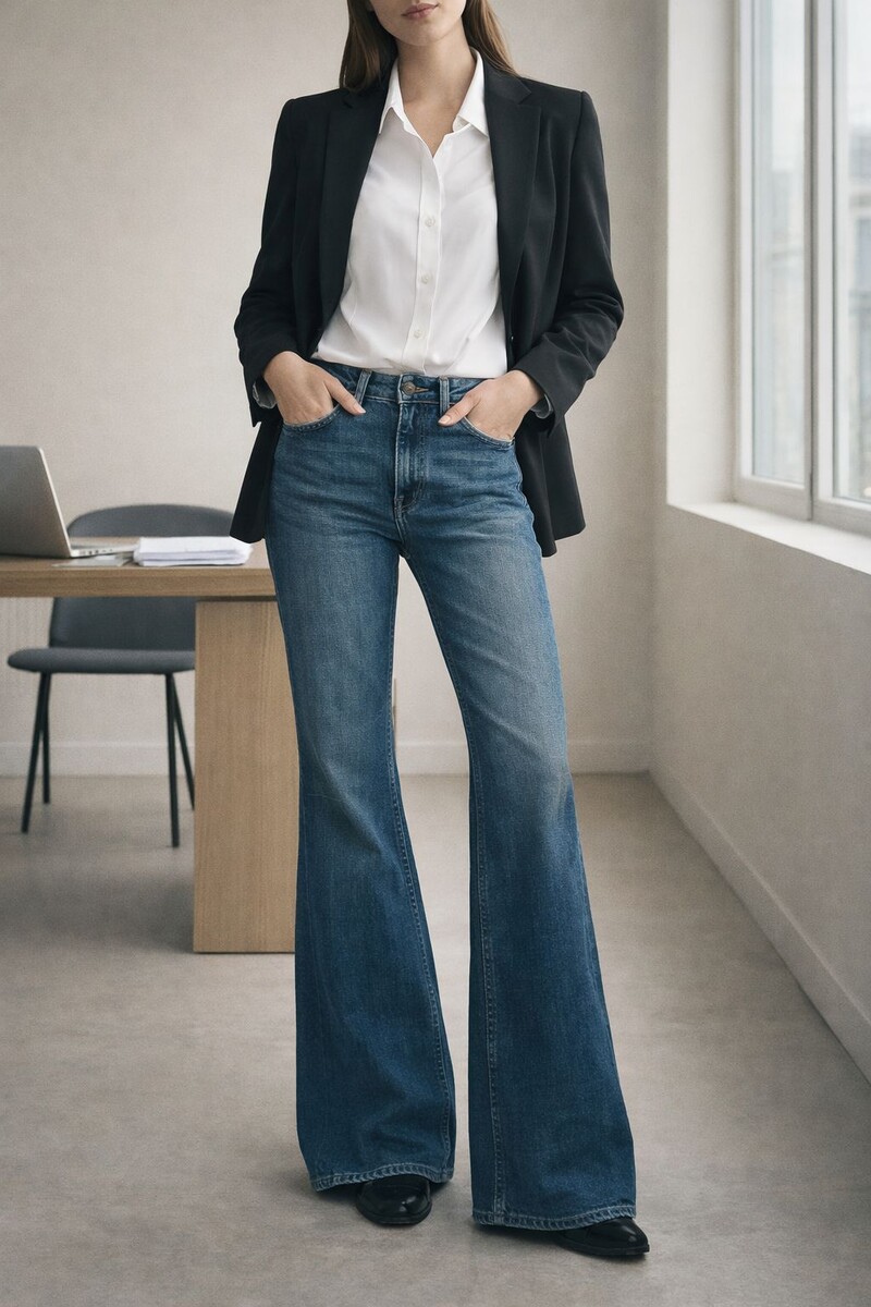 Если хочется джинсы, которые выглядят актуально, но не требуют сложного стайлинга, — у удлинённых flare есть редкое свойство: они сразу дают силуэт и “настроение” образа. У befree это модель BF2611209001, цвет 105 (синий), с классической средней посадкой и клёшем от колена. Клёш от колена даёт понятный баланс: верхняя часть сидит ближе к фигуре, а низ расширяется — из-за этого образ часто смотрится собраннее, чем с очень широкими джинсами, но при этом не такой прямолинейный, как skinny. Здесь производитель прямо описывает конструкцию как “облегающие штанины, расклёшенные от колена”. Удлинённая длина — ещё один плюс для стилизации: она красиво работает с обувью (особенно когда хочется “длины” в силуэте). При этом это же и нюанс (ниже — в ограничениях). Состав понятный и практичный: 98% хлопок + 2% эластан.