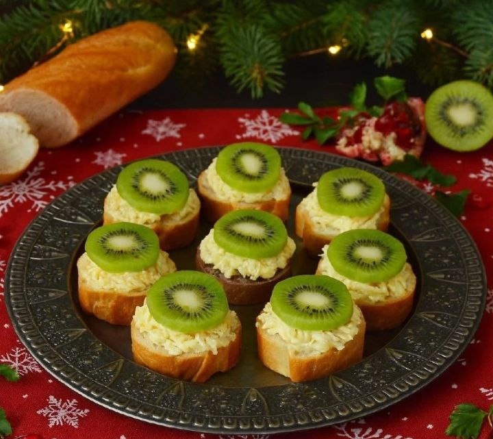 ИНГРЕДИЕНТЫ (на 5 порций): ✅ Багет или белый хлеб — 130 г ✅ Сыр твёрдый — 150 г ✅ Киви — 2 шт. ✅ Чеснок — 2 зубчика ✅ Майонез — 2 ст. л. ✅ Чёрный молотый перец — щепотка ПРИГОТОВЛЕНИЕ: 1. Натереть сыр на средней тёрке. 2. Пропустить чеснок через пресс. 3. Смешать сыр, чеснок, майонез и щепотку перца до однородной массы. 4. Очистить киви и нарезать тонкими кружочками. 5. Хлеб нарезать ломтиками ~1,5 см, при желании слегка подсушить. 6. На каждый кусочек хлеба нанести сырно-чесночную массу. 7. Сверху выложить по кружочку киви. СОВЕТЫ: ✅ Лучше брать киви спелые, но плотные — они держат форму. ✅ Если масса густоватая, добавьте немного майонеза. ✅ Можно использовать ржаной хлеб — получается более пикантно. ✅ Чтобы закуска была хрустящей, слегка подсушите хлеб перед сборкой. ПРИЯТНОГО АППЕТИТА!👍
