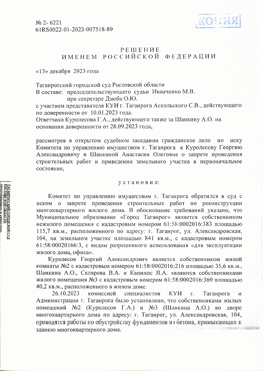 Судебное Решение, видимо, было подготовлено заранее и, судья огласила его без учёта наших возражений, проигнорировав 64 листа документов! Бросается в глаза Решение судьи в отношении второй (нелепой) части требований Иска КУИ, продиктованное Валентиной Семёновной мамой-бухгалтером, привести участок в исходное состояние, которое во время заседания суда, юрист КУИ Аскольский решительно поддержал. Всякий раз, увидев меня, кричала, ты закопаешь котлован и, весь участок приведешь в исходное состояние. Естественно судья никак не могла удовлетворить эту часть Иска КУИ, поскольку она лишена всякой логики и не содержит никаких строительных и юридических норм. Но зато в Решении появился момент, связанный с тем, что мы своей пристройкой закроем от солнечного света три окна двух помещений цокольного этажа, поскольку судья понимала, что отсутствие проектной документации в нашем случае не является препятствием для строительства. Какую-то фотографию окон мама-бухгалтер подвезла по просьбе судьи. И она