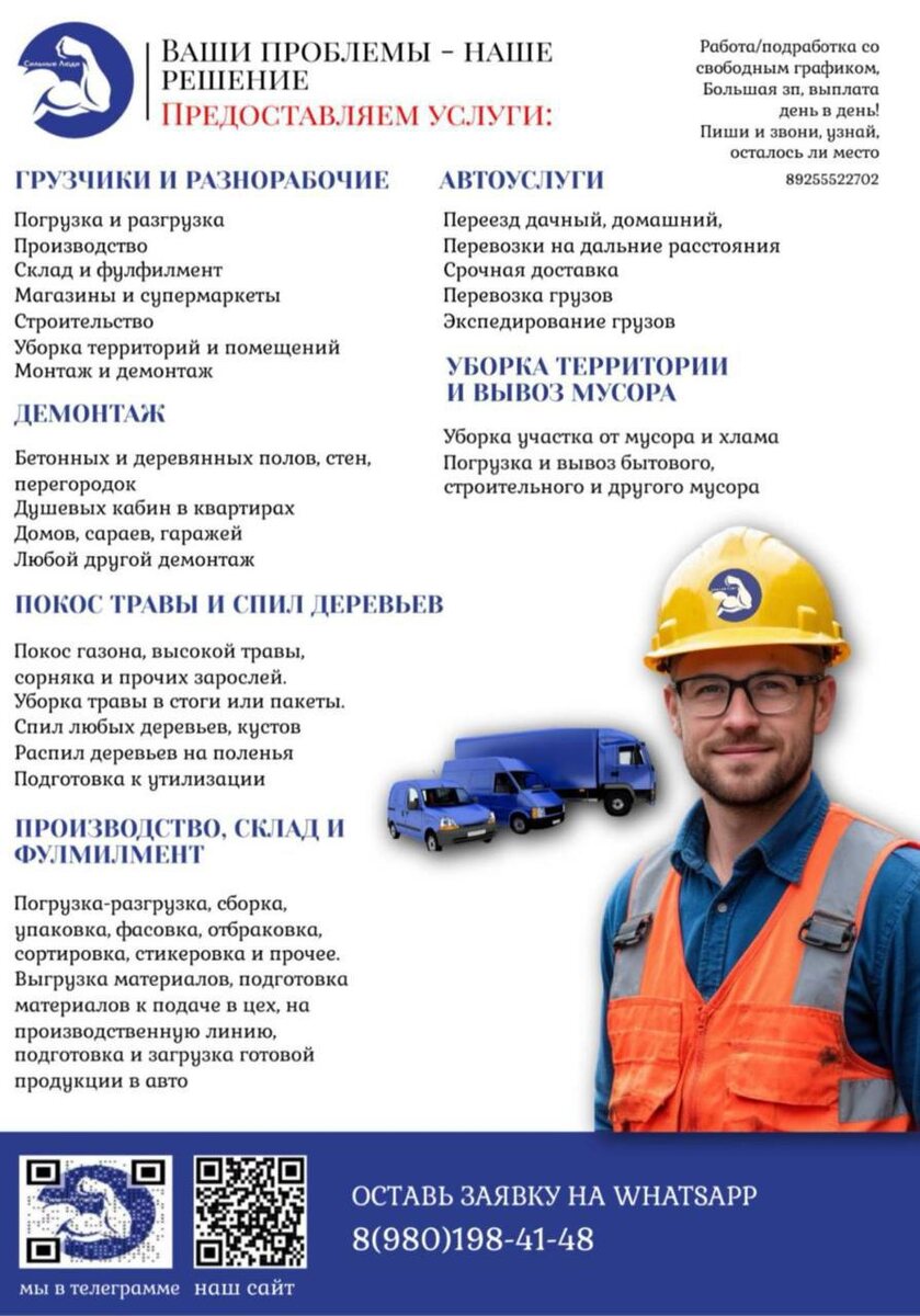 👷♂️Откопаем вашу машину, почистим крышу, тропинки, участки и другое. 🛠️ Свой инструмент и страховка 🚗 Быстрый выезд Для физических лиц и бизнеса ✅ 📝 Оставь заявку на услугу! 📱 Telegram: +7 (980) 198-41-48 💴 Нужна работа? Пиши нам в Telegram: +7 (980) 198-41-48