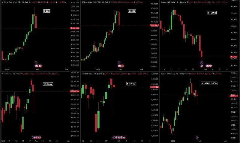 Рынки трясёт так, что шатает всех. Золото: −10,9%, испарилось $4,1 трлн Серебро: −21,5%, минус $1,4 трлн Медь: −10,3%, улетело $40 млрд Палладий: −20%, срезало $65 млрд Платина: −23%, минус $143 млрд S&P 500: −0,6%, сдулось $380 млрд Nasdaq: −1,2%, минус $480 млрд Russell 2000: −0,76%, ушло $25 млрд Биткоин: −6,6%, смыло $108 млрд Ethereum: −7,5%, потеря $25 млрд Итог дня — больше $6,5 ТРЛН сгорело на металлах, акциях и крипте за сутки Подробнее: https://hard-tm.su/threads/143807/ 🕹HARD-TM — Подписаться