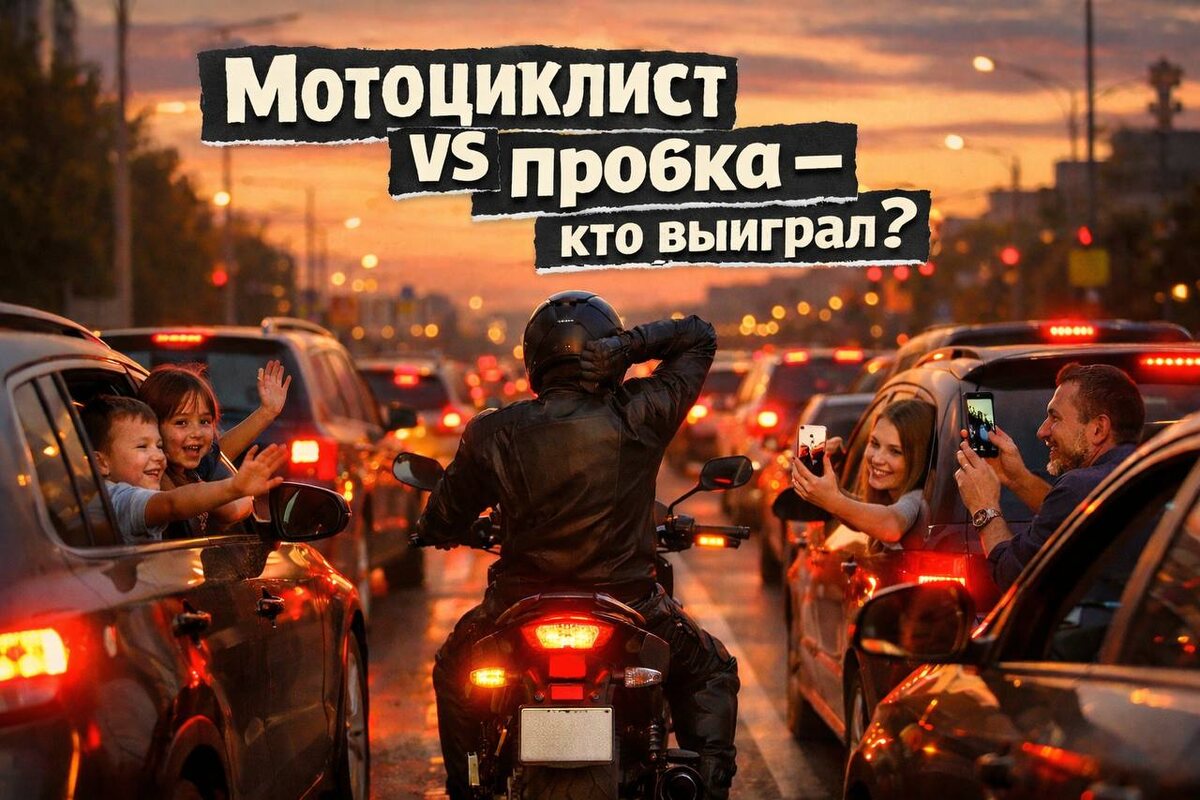 ? Начался вечер пятницы. А давайте представим, что сейчас летний вечер. Город замер в привычной пробке: машины стояли плотно, подпирая друг друга, а длинная гирлянда из красных стоп-сигналов тянулась до самого горизонта. Кто-то проверял прогноз погоды на выходные, кто-то оценивал по навигатору — стоит ли ехать на дачу, а кто-то просто считал минуты до отпуска… через полгода. И вот между рядами — ты. Не мчался, не рисковал — просто аккуратно пробирался сквозь этот лабиринт из машин. Спокойно, но уверенно, как будто пробка была всего лишь фоном для твоего собственного фильма. На светофоре слегка переступил с ноги на ногу, потянулся и помахал руками — размяться. А вокруг уже улыбаются: из одного окна машут дети, из другого — парень смеётся, глядя на тебя, а в третьей машине уже достают телефон. Размялся — стал звездой пробки. Хотя, честно, если бы я знал, что за мной наблюдают, попытался бы сделать вид, что танцую под музыку в шлеме. Водители смотрели вслед. Кто-то дружелюбно отъезжа