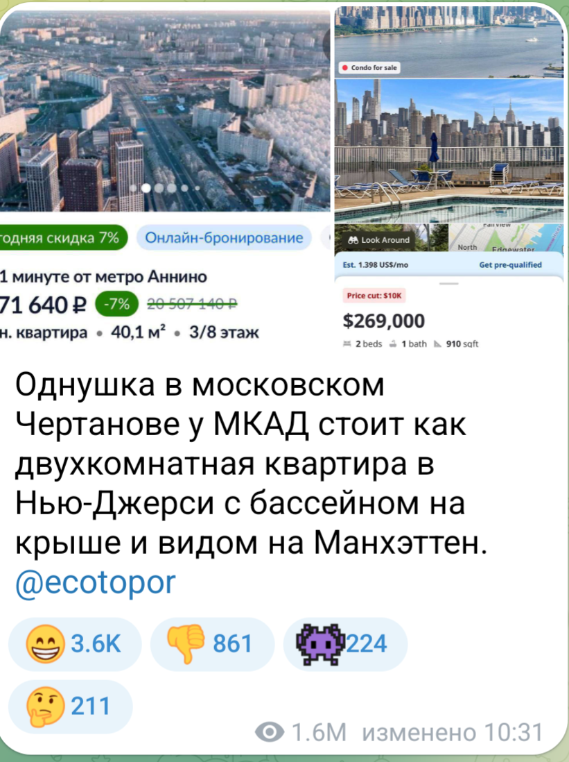 Сначала я подумал, что это фейк или чья-то злая шутка. В новостях пишут: «Однушка в московском Чертаново у МКАД стоит как двухкомнатная квартира в Нью-Джерси с бассейном на крыше и видом на Манхэттен».