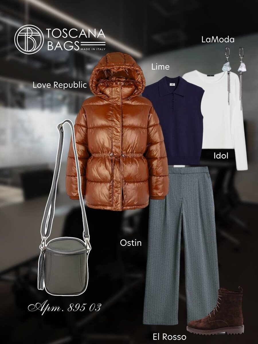 Февраль — месяц, когда так хочется и уюта, и стиля. Зима ещё не сдаёт позиций, но уже тянется к весне, и это идеальное время для смелых комбинаций и интересных деталей. Мы создали пять стильных образов, чтобы ваш последний зимний месяц прошёл тепло, комфортно и безупречно. Для прогулок, работы, вечера в ресторане или смелого выхода в свет — здесь найдётся образ на каждый случай. И конечно, сердце каждого ансамбля — это сумка из натуральной кожи от «Toscanabags», которая не просто дополнит, а завершит ваш идеальный зимний лук. Этот образ — мастерский урок сочетания контрастов. Холодная гамма серых брюк, тёмно-синего жилета и сумки создаёт элегантную и строгую основу. Её буквально «зажигает» смелый акцент насыщенного оранжевого цвета с благородным бронзовым отливом. Вся композиция удивительно гармонична благодаря двум важнейшим деталям: во-первых, глубокие шоколадные ботинки, которые «заземляют» яркий верх, а во-вторых, — чистый белый лонгслив. Он выступает в роли идеального связую