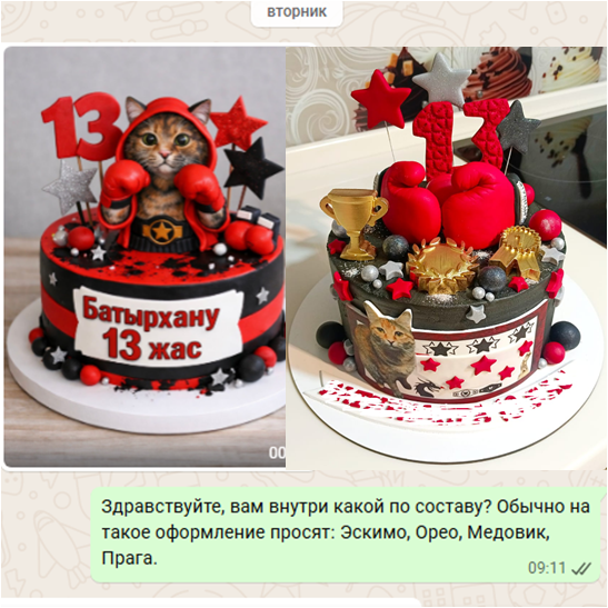 Этот торт я наверное запомню надолго. Всё началось с того, что заказчица отправила мне макет торта (слева кот в перчатках) на ватсапп и попросила сделать такой же, так как её сын увлекается боксом и очень любит свою кошку. Я сначала стал думать из чего сделана кошка и в конце написал ей возможно, это не мастика, а игрушка, т.к. на мастику не похожа и она промолчала. Хотя я обдумывал и не мог понять, топпер или мастика... Она просто смотрела на мои догадки в сообщениях... Потом я её спросил: -какое имя и цифру на торт? И она мне выдала: -также как её торте! После чего я понял, что этот торт она создала через алгоритмы ИИ. Я потратил весь день, чтобы определить из чего кошка, которую создал ИИ, а она делала вид, что не понимает. Чтобы я все мысли направил на её торт и обдумывал её декор. Вы не представляете как я мне было не по себе. Как вообще можно так относиться к людям... На следующий день я ей дал понять, что в курсе её ИИ, причём деликатно без упрёка. И главное ещё раз спросил п