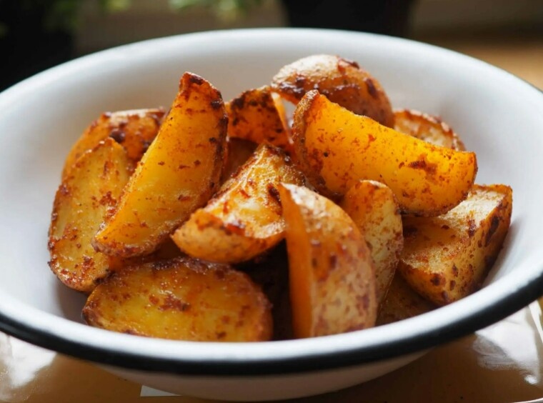 Да, души не чаю в этом методе - удается идеальная картошка. Ее сложно пересушить, она не распадается. Дольки совершенной формы - как нарисованные. А румянец, а золотая корочка - благодаря им эта картошка за столом не гарнир, а главное блюдо. А еще внутри, под золотой корочкой, она нежная, кремовая - и сухой не будет при всем желании. И это просто вкусная картошка. Расскажу про отличный метод приготовления картошки по-деревенски. Метод простой - и интересный. Вкусная картошка по-деревенски: новый метод, рецепт + ингредиенты 1) Картошку почистить, нарезать крупными дольками. Если совсем небольшая - на половинки разрезать. Если это молодая картошка, можно приготовить и с кожурой. Слишком “мельчить” не нужно: чтобы не пересушить. Хотя - эту картошку пересушить сложно благодаря интересному подходу :) 2) Выложить картошку в миску. Посолить - 1 с.л. без горки на 0.5 кг картошки. И - залить кипятком. Оставить на 15-20 минут. Зачем это нужно? Это аналог бланширования - или подваривания :) Раньш