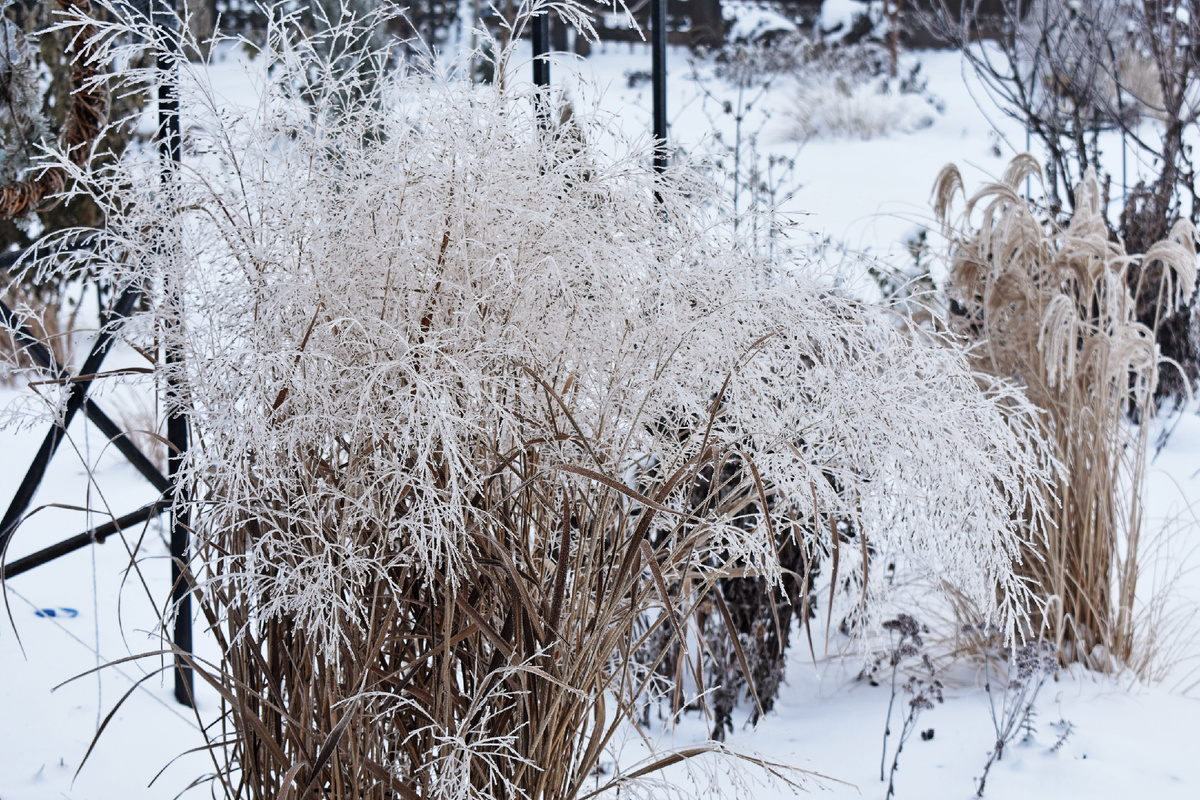 Вчера утром выбежала в сад пофотографировать изморозь. Температура переходила из минуса в плюс, стоял туман, а капельки льда красиво заморозились на растениях. Грех упустить такую погоду. В первую очередь мне хотелось сфотографировать просо. Потому что оно в инее и изморози просто чудесно. Такую красоту сложно передать на фото. Растение прямо-таки светится.