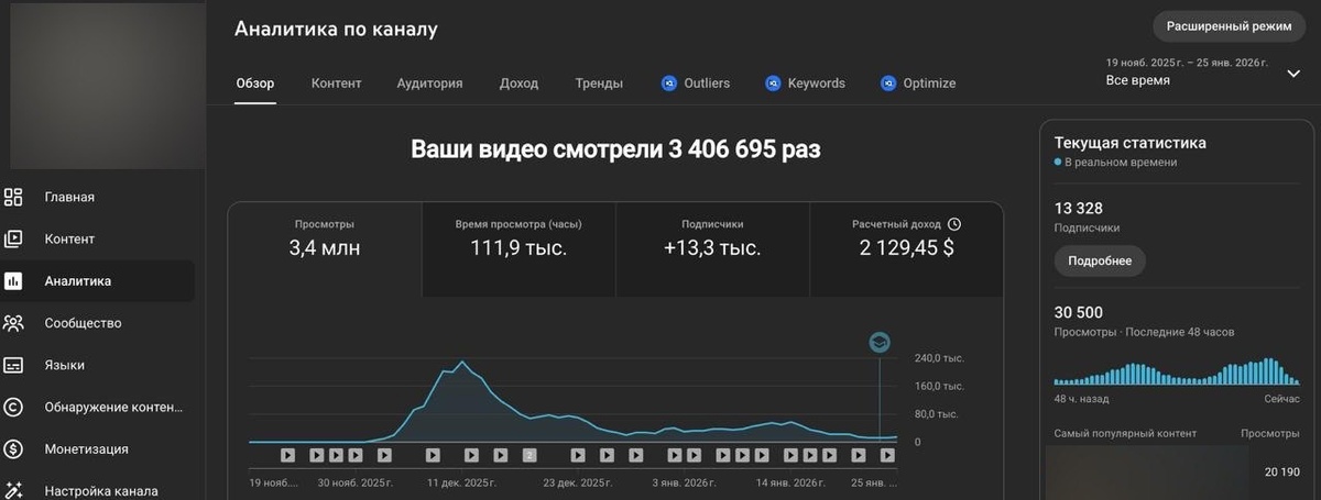 ! 👋 Давайте небольшое голосование устроим. 🗳️ У нас есть канал, который запустили 19 ноября, и сейчас можно видеть, что канал упал — идут небольшие просмотры в районе 15 000 за сутки, и канал приносит примерно 30$ в день. 💸 Тут видно, что после неплохого старта канал корректируется, и в этот момент много ребят сливаются и бросают канал, а многие вообще уходят с YouTube. 😞 Проголосуйте, а как вы поступили бы в этой ситуации. 🤔 📌 Паниковали 📌 Бросили канал на время 📌 Бросили канал на всегда 📌 Бросили Ютюб 📌 Продолжили работу