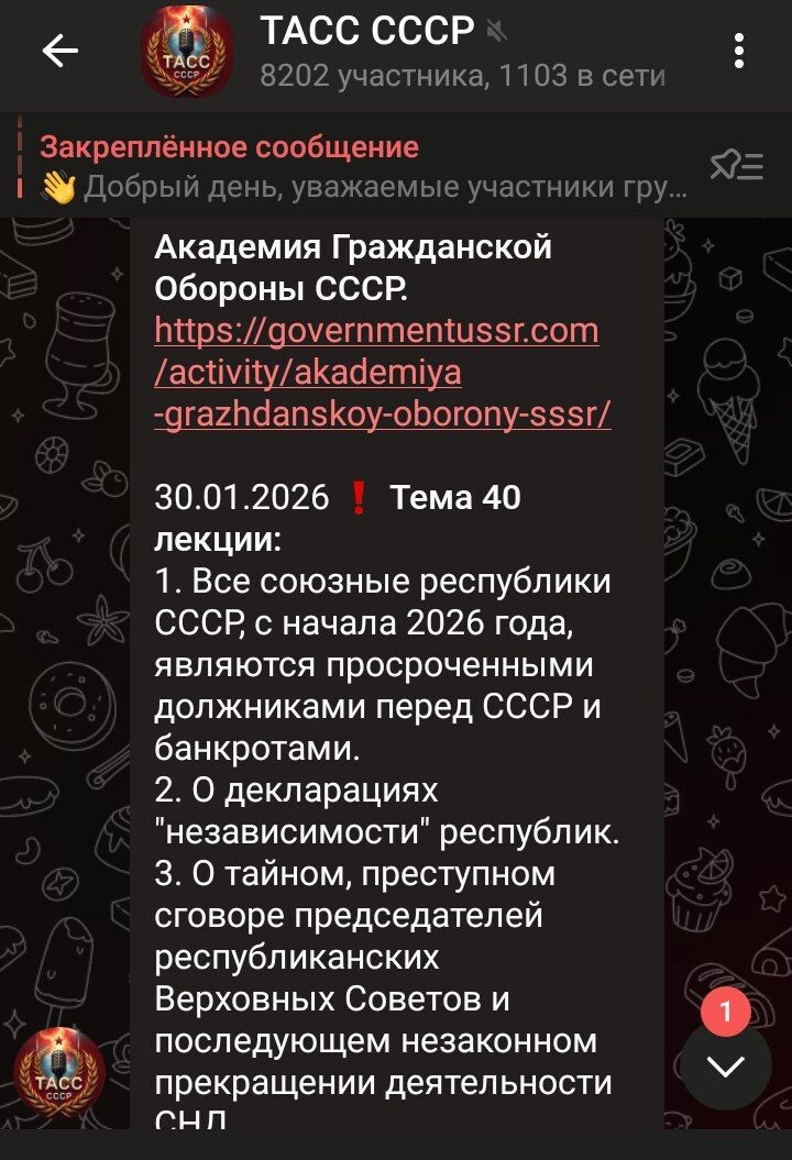 Академия Гражданской Обороны СССР. https://governmentussr.com/activity/akademiya-grazhdanskoy-oborony-sssr/ 30.01.2026 ❗️ Тема 40 лекции: 1. Все союзные республики СССР, с начала 2026 года, являются просроченными должниками перед СССР и банкротами. 2. О декларациях "независимости" республик. 3. О тайном, преступном сговоре председателей республиканских Верховных Советов и последующем незаконном прекращении деятельности СНД. =============================== 👉🏻 30.01.2026 в 19:30 Мск. НА РАДИО «КРАСНАЯ ВОЛНА» https://ussr-radio.com/home Новое Советское Радио ===============================