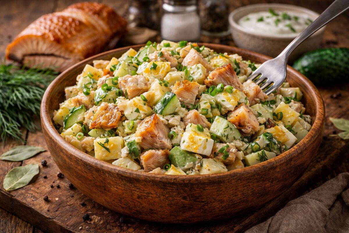 Вот сколько ни добавляй зелени, соусов или лёгких ингредиентов, они всё равно остаются ровными. Но, рыба горячего копчения в салате совсем другое! Этот ингредиент главный герой, который сразу задаёт тон всему блюду. Я готовлю его, когда хочется не просто салата «к мясу», а самодостаточного ужина. Чтобы нарезать, перемешать и уже через несколько минут поставить на стол что-то по-настоящему вкусное, без долгих танцев на кухне. Рыба горячего копчения штука благодарная. Она уже прошла термообработку, у неё плотная текстура, яркий аромат и тот самый вкус, который не требует усилителей. В отличие от слабосолёной, она: Именно поэтому салаты с такой рыбой получаются насыщенными, но не тяжёлыми. Я чаще всего беру: Главное правило в том, что рыба должна быть сочной, а не пересушенной. Если мясо ломается хлопьями и не выглядит «древесным», значит, всё хорошо. Перед добавлением обязательно убираем кожу и косточки. В салате должны остаться только чистые кусочки — это сильно влияет на общее впечатле